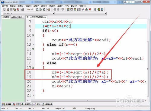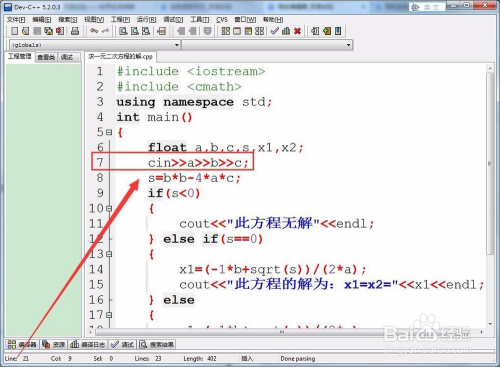 首先,界说几个实型变量,用来保留一元二次方程的3个系数,以及计较出的解。