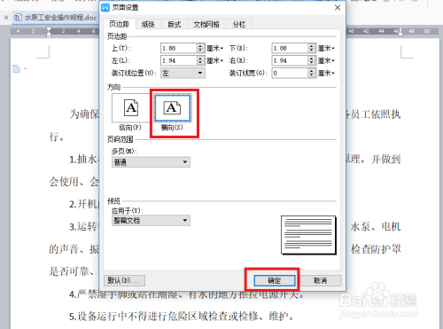 进入页面设置信息方框,在方框中找到偏向下方的“横标的目的”,点击一下,然后再点击”确定“,此次WPS页面就可以设置当作横标的目的了。