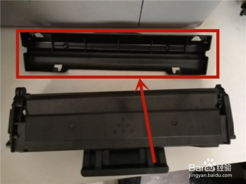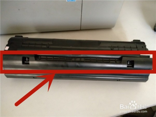 将粉盒装入打印机之前,要记得把硒鼓庇护盖卸下。方式:没有螺丝,顺着启齿偏向(图中箭头偏向)两头同时用力拉动即可直接取下。