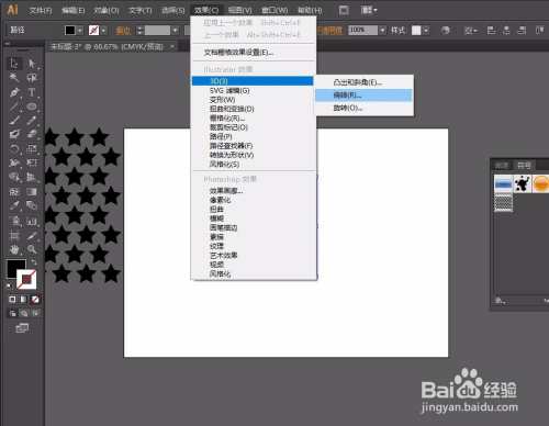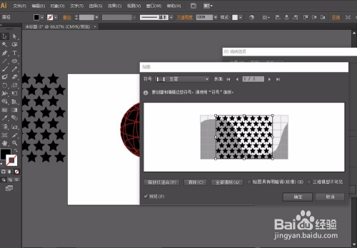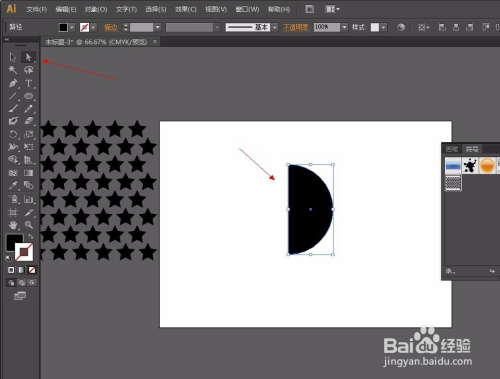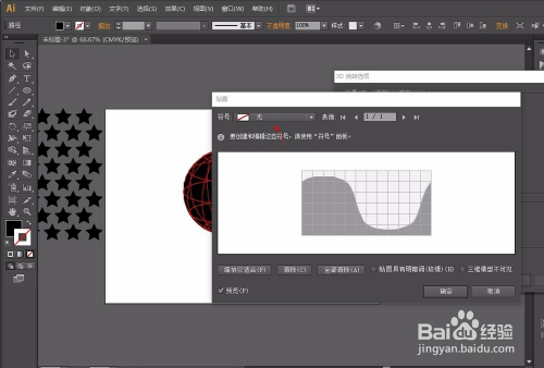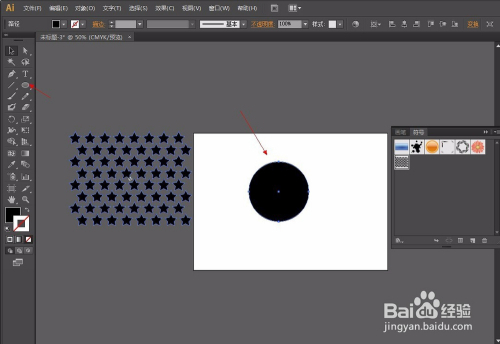 第三步:选择符号东西添加图形,如图,再利用椭圆东西画出一个正圆,用直接选择东西把左边的点删除,然后选择结果-3D(3)-扭转-勾选预览-点击贴图-选择图案-再点击缩放以顺应-确定。操作如图: