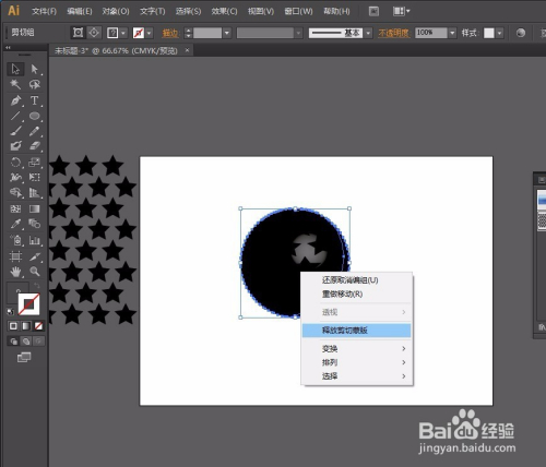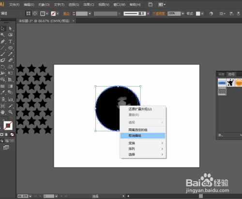第四步:选择图形,点击对象-扩展外不雅,回到图形单击鼠标右键得出对话框-打消群组(两次)-再单击鼠标右键得出对话框-释放剪切蒙版。然后选择星形将其拉出放置旁边。操作如图: