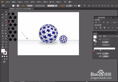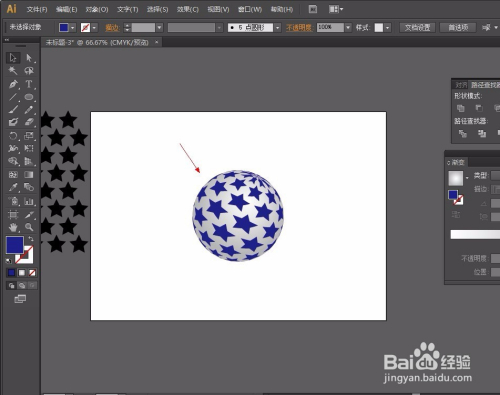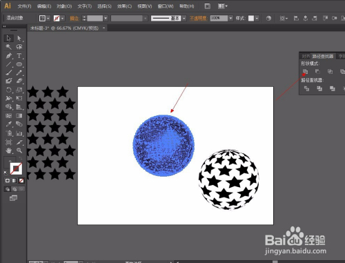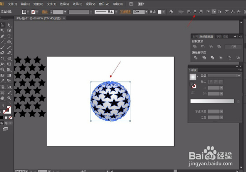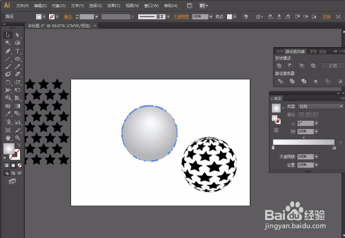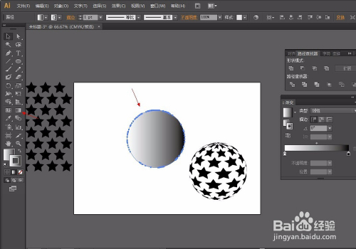 第五步:选择圆,因为里面有无数个圆所以我们要将他弄当作一个圆,所以选择路径查找器东西-联集。再给圆增添一个渐变颜色从白到百分之20或者30的黑就可以了,渐变弄好后,选择对齐东西将圆与星形对齐。操作如图: