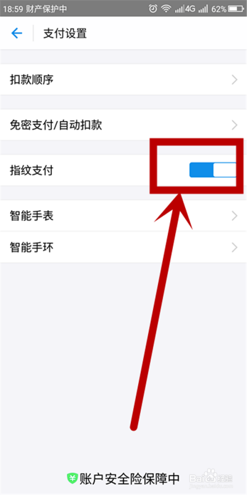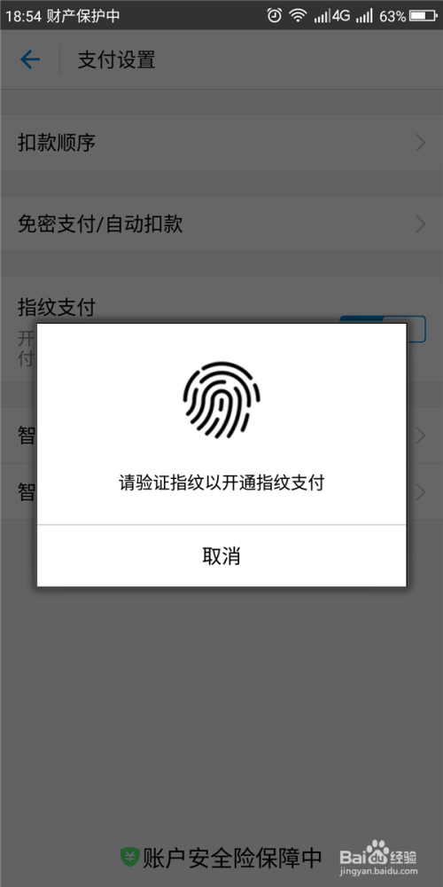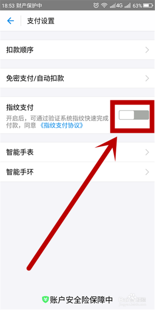 在“付出设置”页面找到“指纹付出”,点击开通。