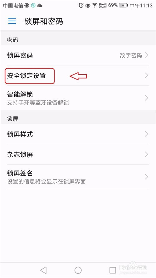 点击进入“锁屏与密码”的功能块中,找到“平安锁定设置”。