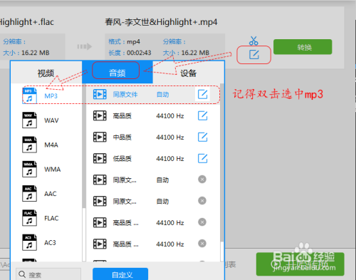 点击输出文件里的编纂图标,把输出格局mp4改为mp3。