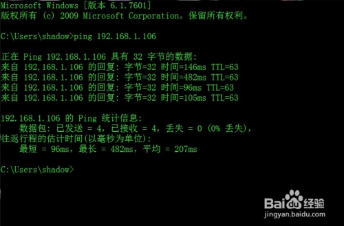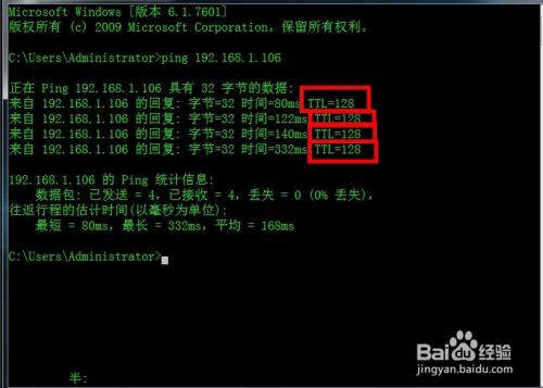 进入号令提醒符后,输入你要“ping”的IP地址,可以看到IP地址答复的TTL值当作功点窜为128,申明点窜当作功