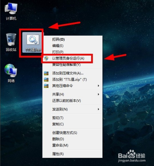 鼠标右键重定名好的“TTL值.bat”文件,选择“以办理员的身份运行”