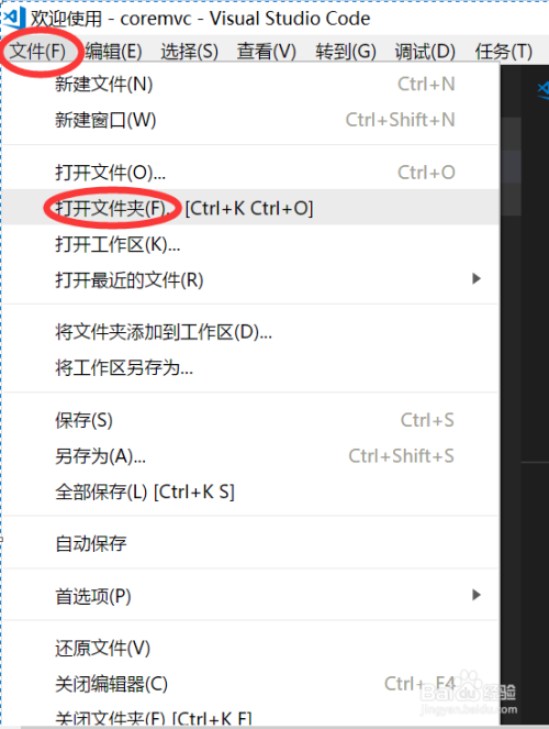 打开Visual Studio Code,依次点击菜单栏中的“文件”->“打开文件夹”,如下图所示: