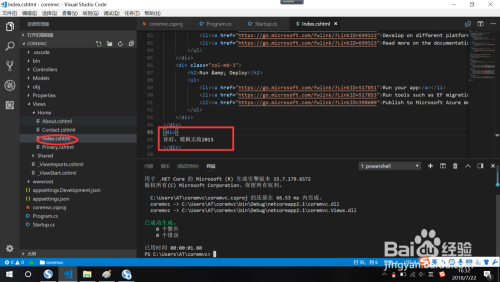 我们在视图Index.cshtml中添加一个div,并写入一段文字,如下图所示: