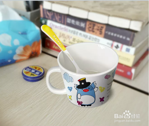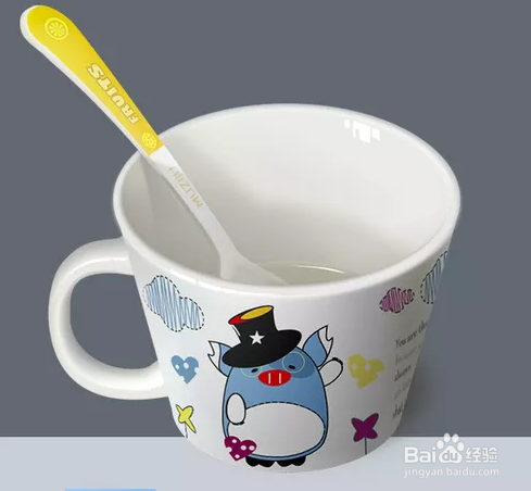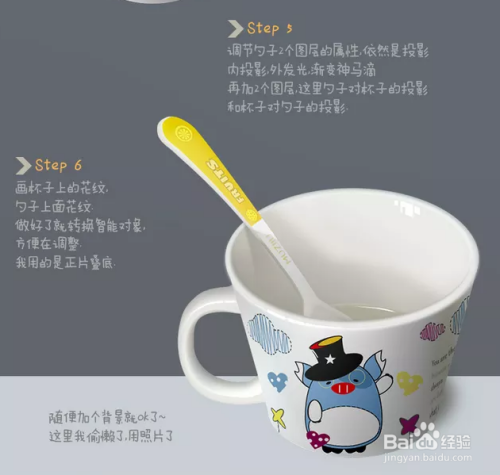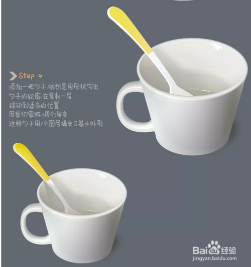同样的,勾出勺子的外形,添加蒙版,遮挡被杯子盖住的部门。加上暗影。