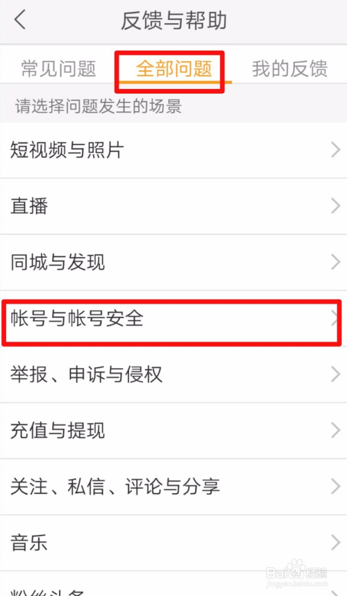 再接着进入到【反馈与帮忙】页面之后,点击【全数问题】,再点击【账号与账号平安】。如图所示