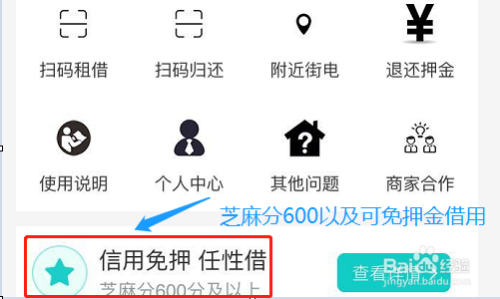 点击今后会跳转到街电办事的本家儿页,我们在该页面的中心位置有显示芝麻分600分以上可免押金的提醒;若是我们的芝麻分达到了,那么点击该页面左上角的"扫码租借"即可;