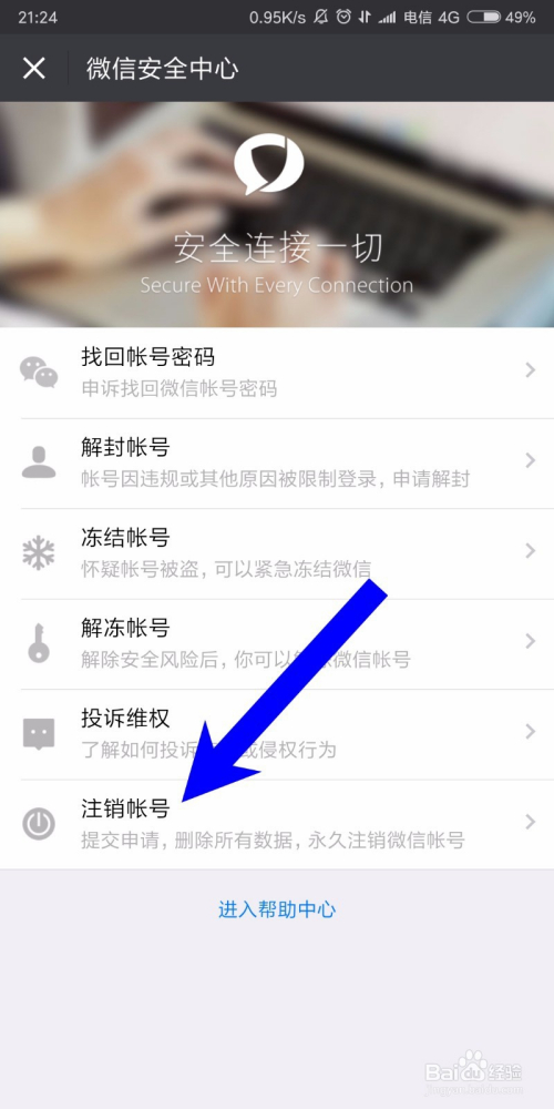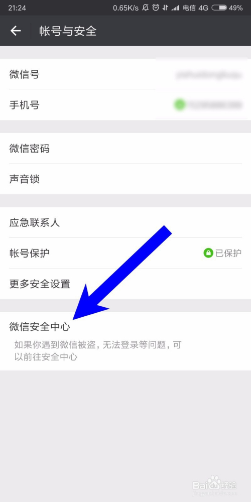 在账号与平安中,我们找到微信平安中间,点击进入,如下图所示,