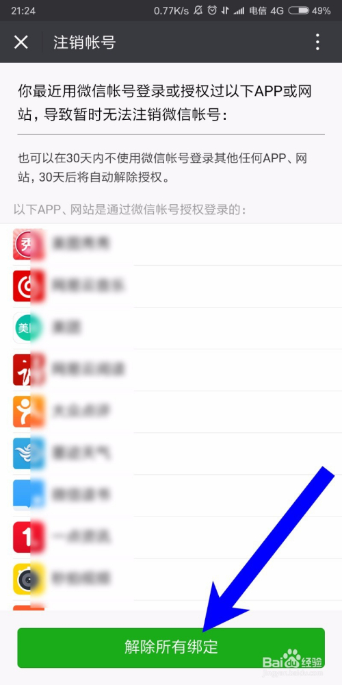 最后我们就可以看到与微信绑定的手机应用了,我们点击下方的解除所有绑定按钮,如许就可以解除手机应用,有微信的绑定了,如下图所示,