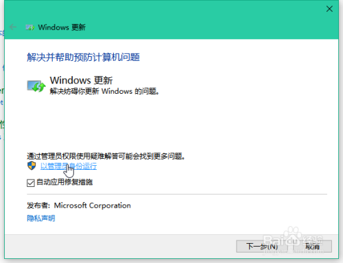 弹出疑难解答后,请以办理员身份运行。(操作方式:弹出疑难解答时,点击【高级】,再点击【以办理员身份运行】即可。)