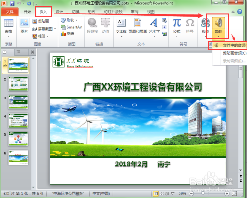 选择插入菜单选项,再选择音频,在弹出的下拉列表中选择“文件中的音频...".