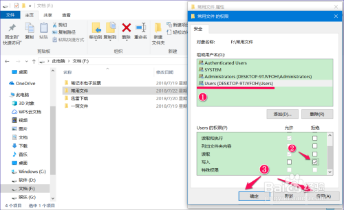 在常用文件 的权限窗口中,❶ 点击:Users;❷ 点击:Users 的权限栏中写入 - 拒绝的复选框打勾; ❸ 点击:应用 - 确定;