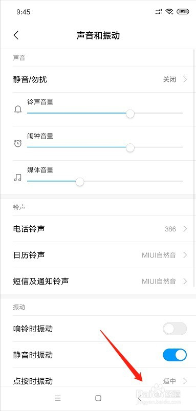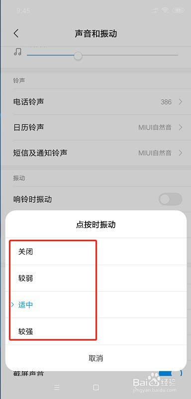 第四步:我们在点按震动中可以对点按震动的状况进行设置,当前是适中。