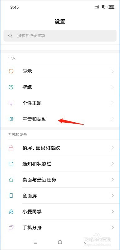 第二步:我们进入设置界面之后呢,我们点击:声音和震动选项。