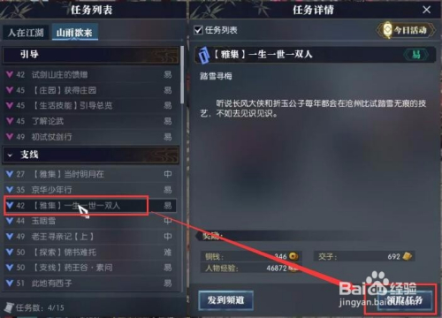 然后查看可接使命,找到这个雅集平生一宿世一双人支线使命,点击使命书右下角的接取使命,如许就会主动跑到使命发布人NPC那边接使命了。