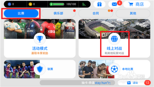 登录实况足球手游,在游戏的本家儿界面上方点击【角逐】,在角逐下方点击【线上对战】。
