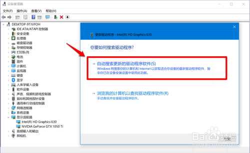 此时会打开一个 更新驱动法式 - Intel(R) HD Graphics 630或者NVIDIA GeFcrce GTX 1050Ti 窗口,我们点击:主动搜刮更新的驱动法式软件;