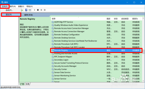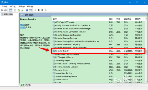 方式二:在当地办事中禁用Remote Registry”办事项,可限制Windows10系统注册表被长途拜候。