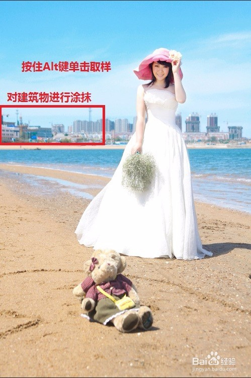 在照片布景天空处按住【Alt】键单击进行取样。按住鼠标左键并拖动,盖住布景的建筑物。(按【Ctrl++】组合键放年夜照片进行涂抹,结果更佳。)