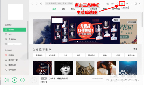 打开电脑版QQ音乐,点击右上角的三条横杠本家儿菜单选项。