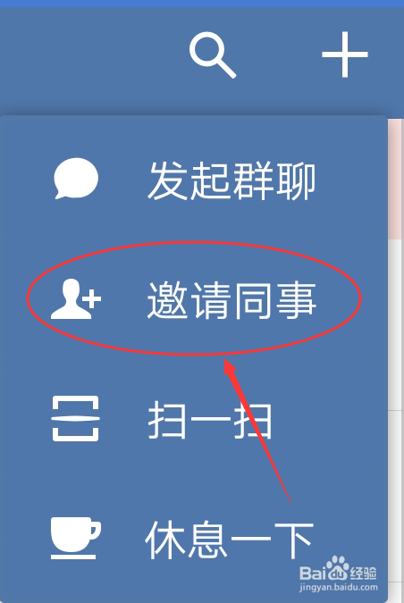 当然,若仍是进不去,可以找一个同事,在他的企业微信中,点击右上角的加号按钮,鄙人拉框中选择邀请同事选项。
