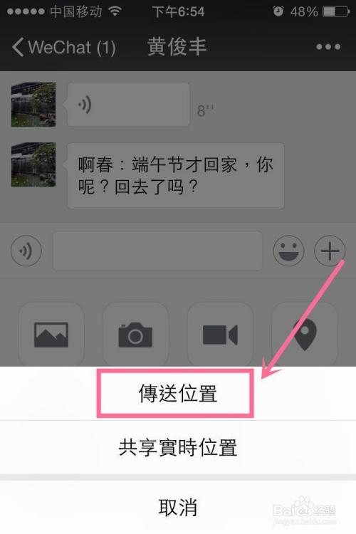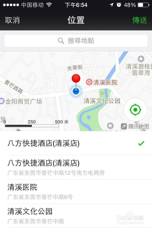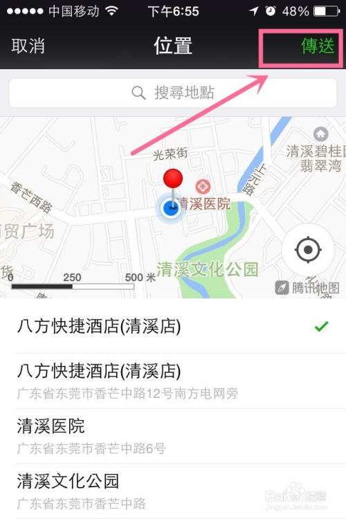 选择切确的位置后,我们点击右上角的"传送”按键,便可以把定位发给对方。