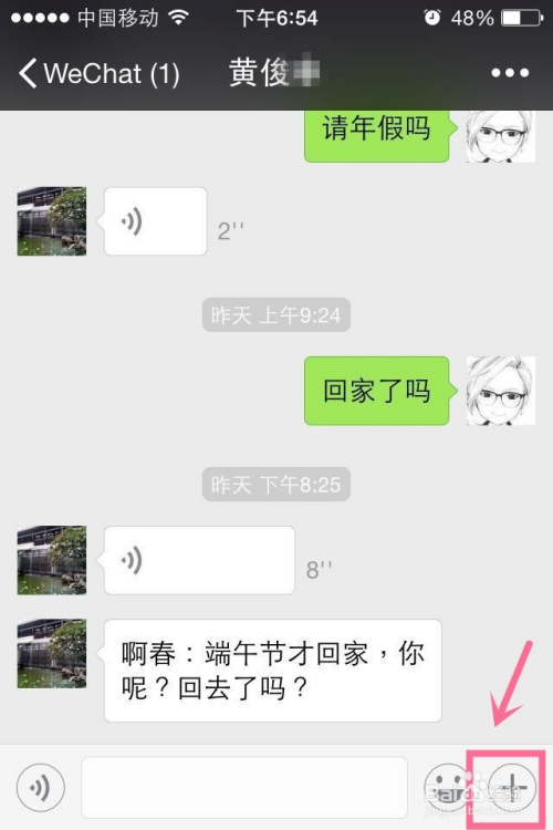 打开对方的聊天窗口,在聊天窗口的右下角有一个“+”图标,我们点击进去。