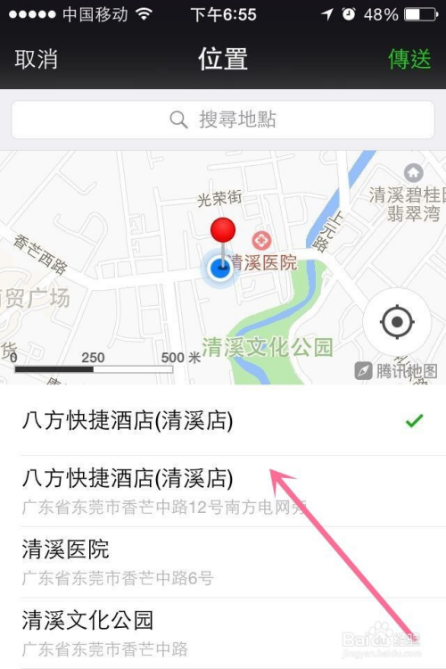点击“传送位置”后,微信会主动定你的大要位置,你可以选择你一个最切确的位置。如下图,假如就在八方酒店,那我们就选第一个,打上勾勾。