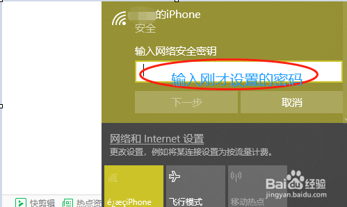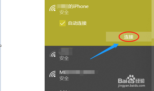 点击该热点今后,在右下角可看到一项“毗连”,如上图;点击毗连然后将我们适才在手机上设置的热点密码输入,如许就毗连当作功了;