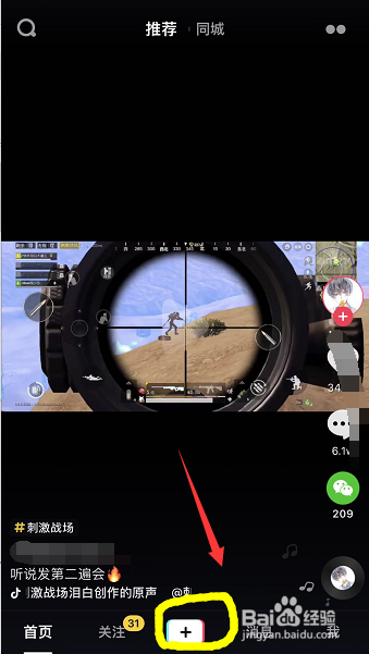进入抖音首页,点击中心的加号,如下图所示
