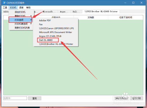 点击“打印机”后可以在子菜单里看到“打印选项”,再点击打印选项就可以选择需要设置的打印机,这里我们以 DL-888D型打印机为例:点击DL-888D就可以打开该打印机设置界面。