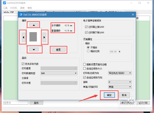 打开打印机设置界面后就可以看到在左上角的偏移功能区有上下摆布四个偏向的调整按钮,点击响应偏向的按钮就可以调整偏移量,每次点击偏移量为0.5mm,若是没调好还可以点击“重置”后再从头调。
