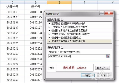 接下来就要我们输入法则了,法则很简单,好比我们的表格时对比C列和D列,然后标识表记标帜出D列分歧的处所,那么公式可以如许输入=COUNTIF(C:C,D1)<=0。这个公式的意思就是在D列中标识表记标帜出与C列分歧的数据,然后输出我们设置的格局。