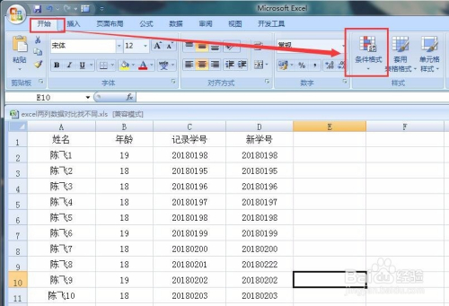 如图我做了一张简单的excel数据表格,有两列数据正常是一样的,就是记实学号和新学号,可是新学号可能有变更,所以要对比一下找出excel双方两列数据的分歧之处。