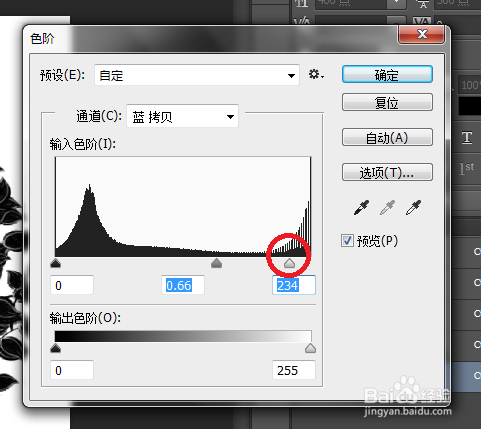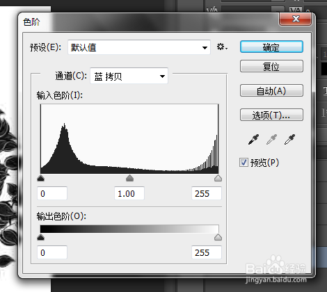 8、调整到只有纯口角两色(你需要保留的部门酿成纯黑色,不需要保留的部门 酿成纯白色)的时辰,点击确定。然后按住Ctrl并点击蓝色通道,此时已经拔取好了黑色的部门(在口角两色的分界上已经呈现了选框),如图。