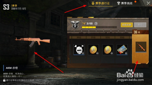 在赛季通行证页面同样也可以获得兵器皮肤,我们首先要做的就是把赛季品级升到36级,达到36级之后就可以领取AKM的永远皮肤——赤橙,小编挺中意这条目皮肤的,慢慢尽力进级吧。