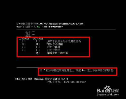 在“更改属性”中选择“断根此用户的密码”选项,按“Y”键确认保留更改,然后重启电脑