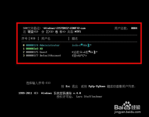 进入密码断根界面,输入“序号1(选择Windows 系统地点的分区)”