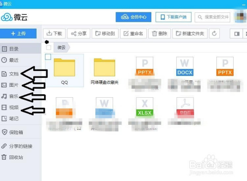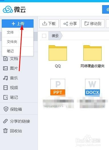 打开微云后可以看到可以或许上传文档、照片、音乐、视频等。