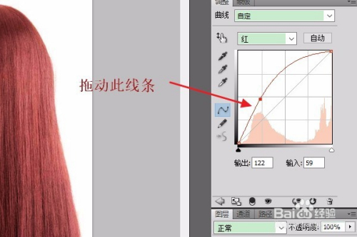 接下来页面右侧就会多出一个曲线调整图,然后我们从中选择一种颜色通道,大师都知道任何颜色都是由红蓝绿三原色构成的,我们假设以红色为例;