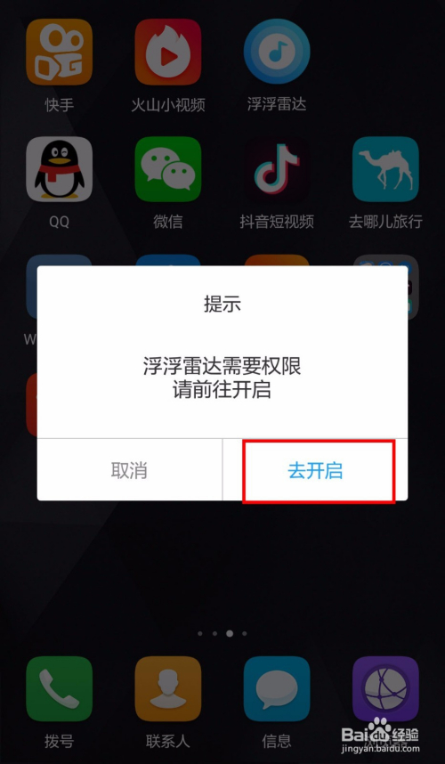 安装好浮浮雷达后会提醒请开启权限,就是要打开它的悬浮窗权限,点击【去开启】。