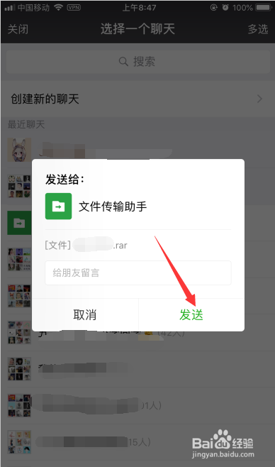 3. 在【选择一个聊天】页面下,选择如图所示的【文件传输助手】或者点击任何一个伴侣,进行转发。多选的话点击右上角的【多选】即可。