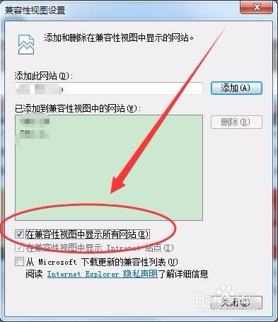 兼容性视图设置窗口中,可以添加兼容性视图的网站。