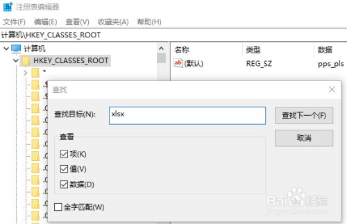 为了便利查找,我们可以用查找功能:选中HKEY_CLASSES_ROOT→编纂→查找 输入xlsx 查找