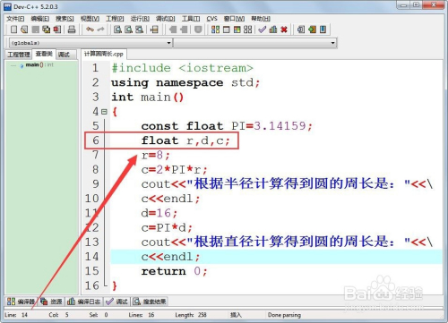 接着,界说三个实数类型的变量,用来保留圆的半径、直径和周长。